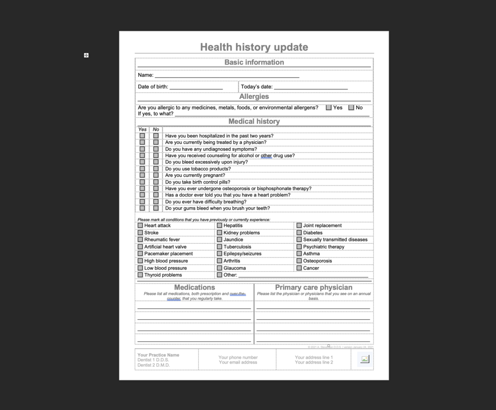 A dental health history update form designed to be both visually appealing and clinically relevant for periodic updates to a patient's health. Made by a dentist for their practice and refined over 5 years. Available in 2 formats varied by degrees of customization and ease of implementation.